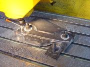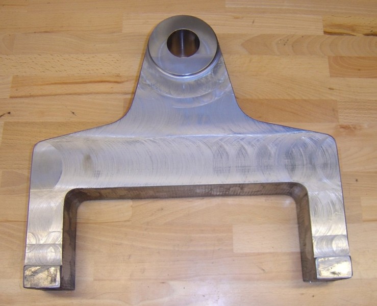 Bei der Fertigung eines Gehänges für einen Verladebagger, wurden die brenngeschnittenen Einzelteile, an ihren Kontaktstellen durch CNC-Fräßen auf ihr Passmaß fertigbearbeitet. Nach dem Verschweißen der Einzelteile, erfolgte ein Ausspindeln der Augen für den Aufnahmebolzen.