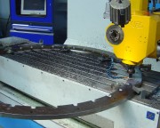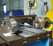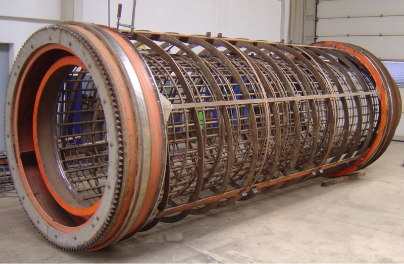 Bei der Überholung einer Siebtommel musste der verschlissene Verbindungsflansch zwischen Antriebsritzel und Käfig erneuert werden. In das Wasserstrahl geschnittene und gebohrte Bauteil wurden dann die Ausfräßungen für die Rundstäbe eingebracht.